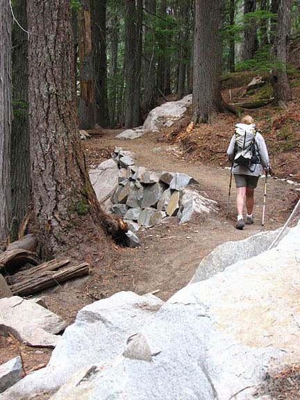 We cut and cut, and gradually a trail 3 to 5 feet wide emerged. To maintain the straight and steady grade, all low areas needed to be filled in. Remember those rocks we dug up or blasted out of the trail? We brought them back to raise the tread level in low spots, to construct outside retaining walls and to backfill those walls with rubble. In some areas, these walls are more than 6 feet high and 50 feet long. Volunteers cut the backslope to precisely 45 degrees (okay, approximately 45 degrees) in order to minimize erosion and, finally, to create a durable tread surface, they ensured that a thick layer of mineral soil covered the entire trail.