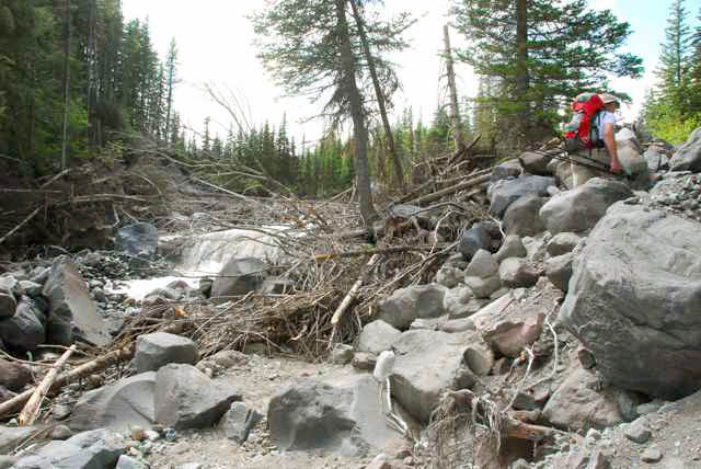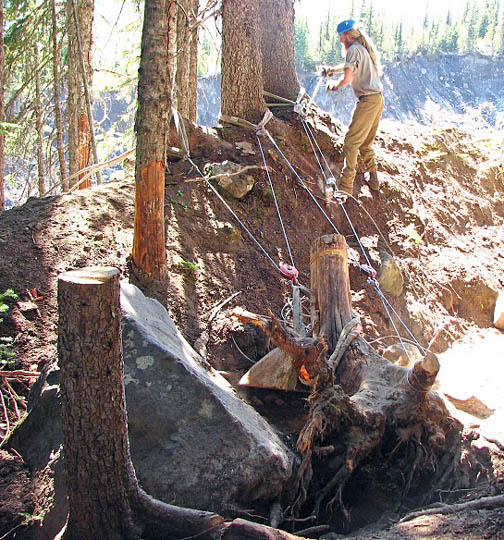 Located in close proximity to the dynamic, glacially-fed White River, the original Glacier Basin trail has been frequently damaged by the river’s shifting course. During fall 2006, severe floods decimated significant portions of the lower trail. Rather than repair the damage, park authorities opted to build a new trail — one that would not be subject to the river’s frequent flooding. Design, layout and permitting for the trail started in 2007 and carried on into 2008. The replacement trail was to be built on the steep hillside above the river’s floodplain and stay true to its original character with a straight, steady, gradual grade.