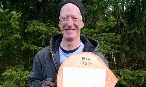 WTA welcomes Jim Springberg to the Golden Rock Bar Club. These folks have given 1,000 days of volunteer work to trails.