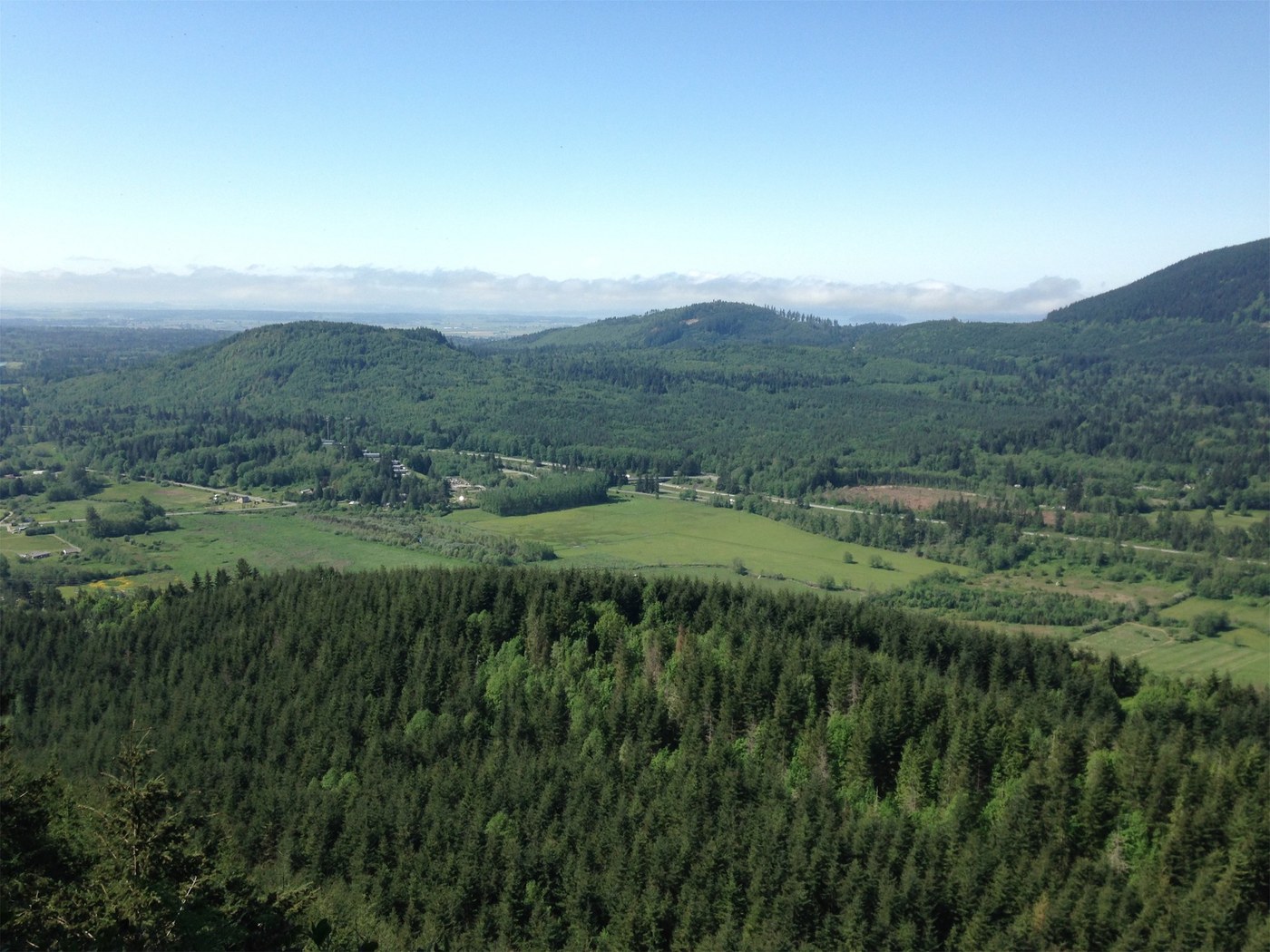 Continue trending upwards along old logging roads — first 1340, then 1300, then 1000—to the overlook at the top. Enjoy unobstructed views of the Skagit Valley, Olympic Mountains and Puget Sound Islands from this perch before heading down.