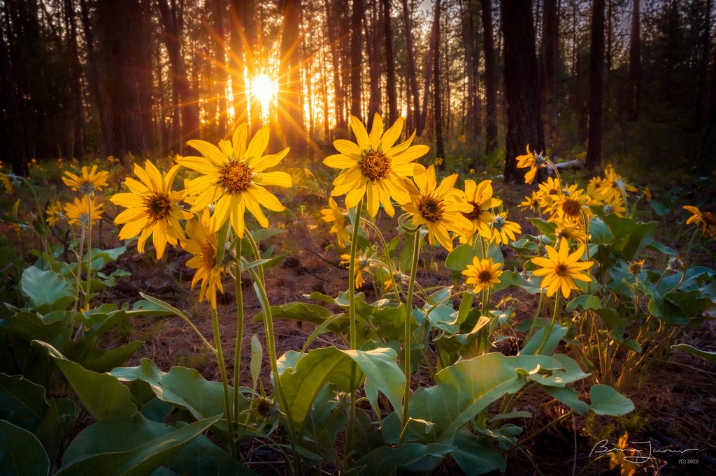 Arrowleaf balsamroot flowers dot the forest floor as hikers ascend through ponderosa pines on a series of switchbacks. At the one-mile mark Arrowleaf connects to the Lost Apple Trail. By turning left and taking the Lost Apple trail, users will find themselves crossing a meadow and looping back towards the trailhead.