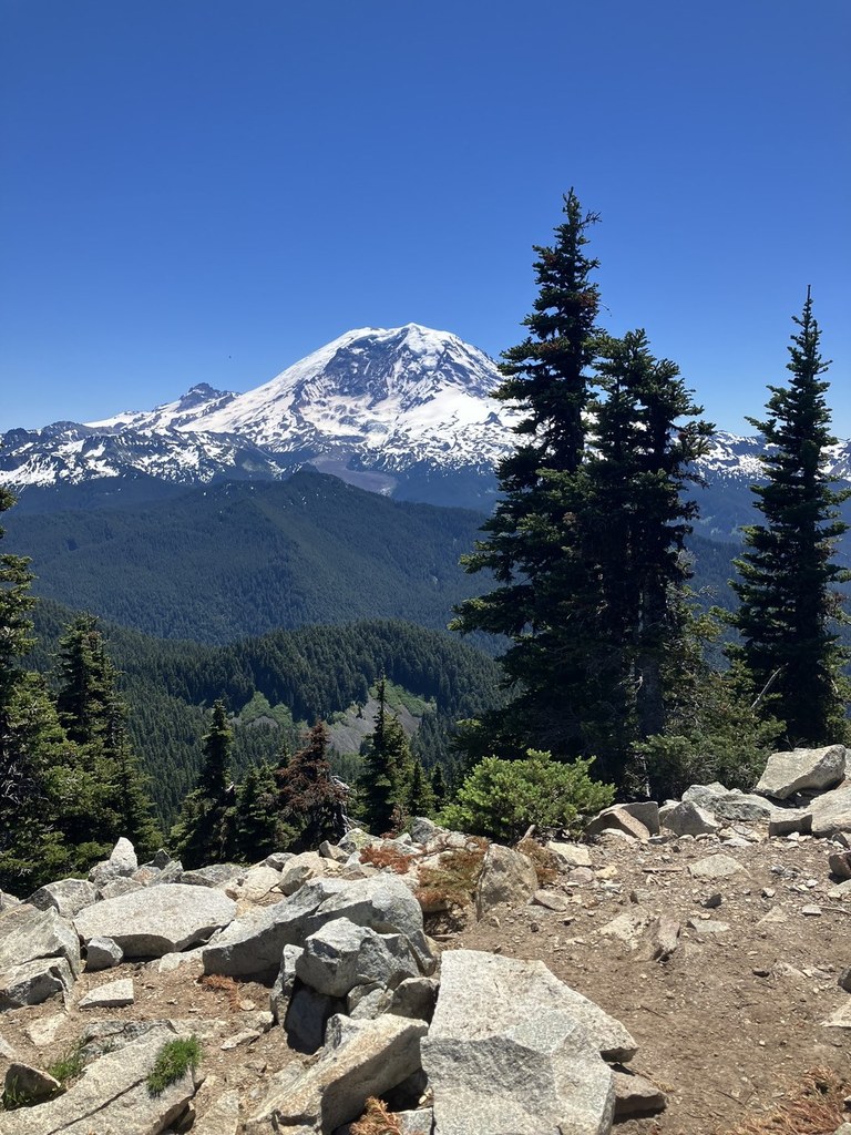 Bearhead Mountain is a moderate, well-marked trail through the forest that carries you to an old fire lookout site with a bold and brassy Rainier view.