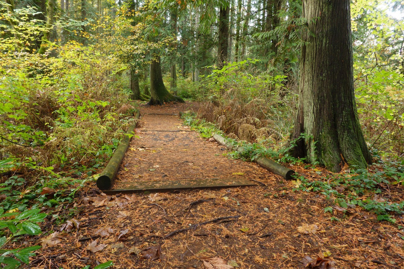 The loop trail passes through moist forest with a lot of very large trees, both deciduous and coniferous. A few well weathered stumps hint at the size of trees earlier loggers harvested here. The stumps seem no larger than the bases of the largest trees you see today, so perhaps some old growth does remain in the park.
