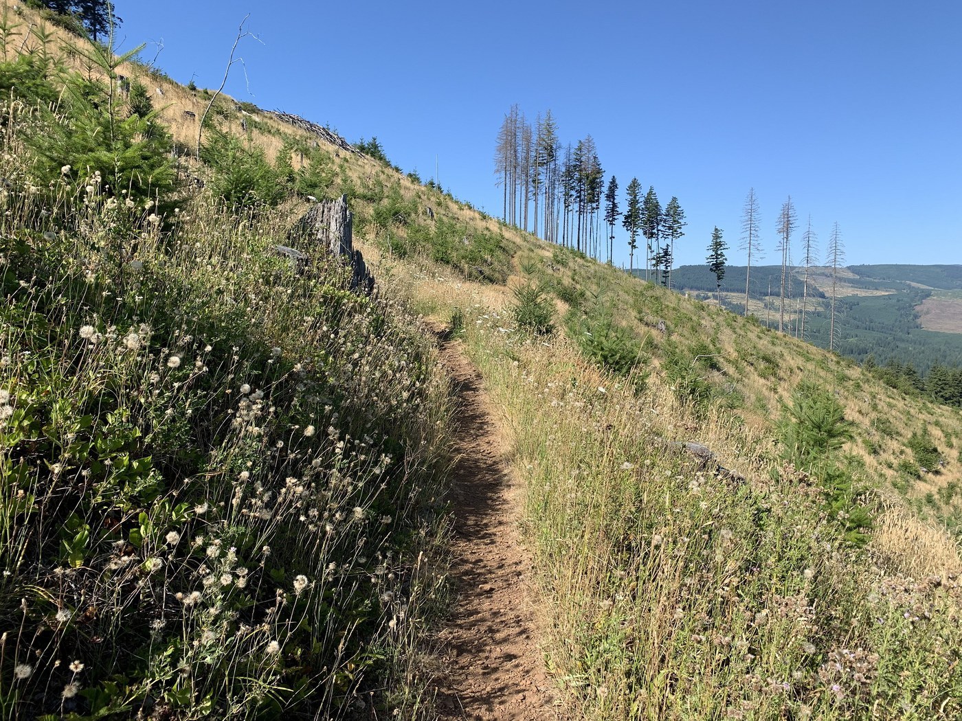 The trail is worthwhile for its beginning and its destination, and because it hooks up to other trails as part of the evolving Chinook Trail. The middle section of the hike, however, is rather depressing. Clearcut logging and illegal ORV riding has really impacted this trail. Tire ruts fill up with water from rains with nowhere to drain.