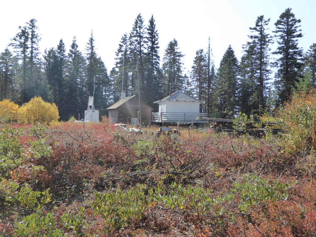 There you’ll find the cap of the lookout tower on the ground, along with stacked lumber and hardware from the legs, and some outbuildings… including a white-painted outhouse tucked discreetly amongst the trees.