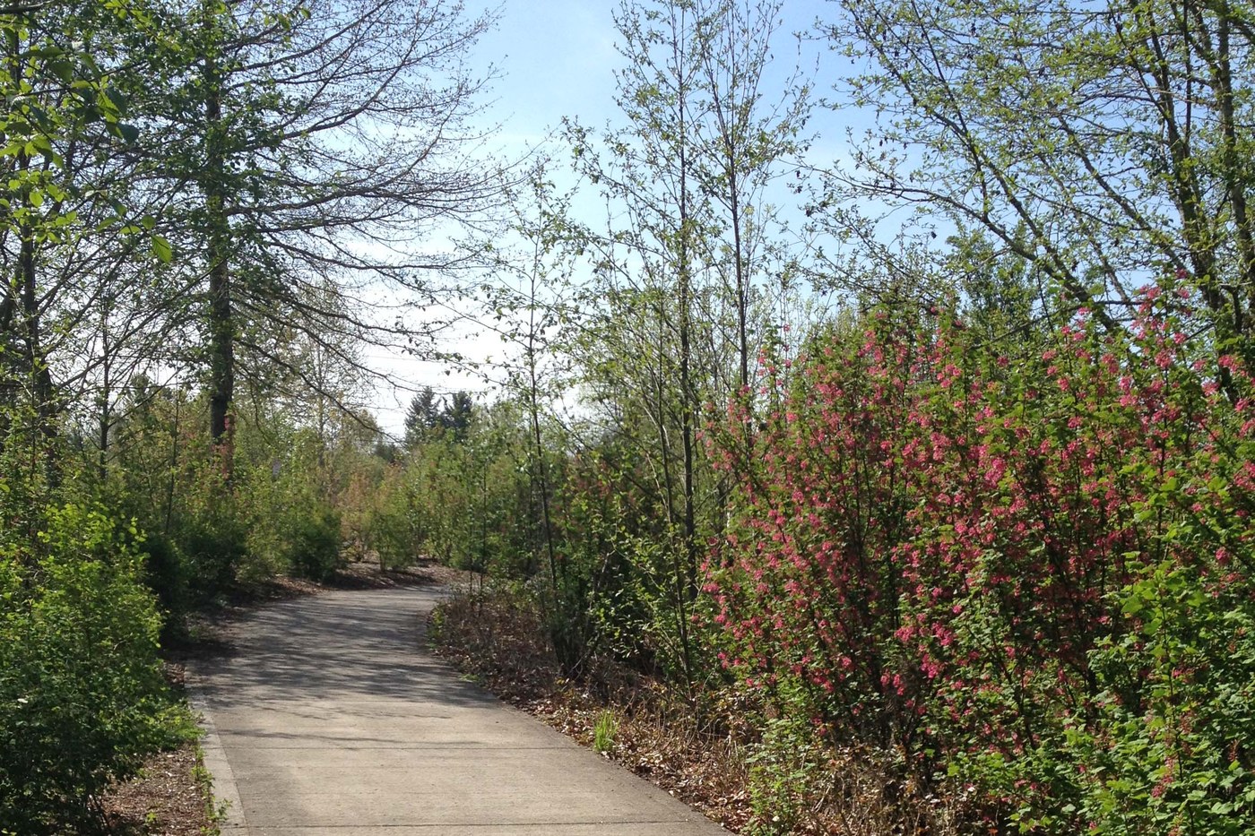 From the east trailhead at NE 92nd Avenue, head west along the wide concrete and paved trail. The trail is in the middle of a wide greenway and a Bonneville Power right of way. The high-voltage power lines soon come into view and the trail follows near the power lines for about half of the trail.