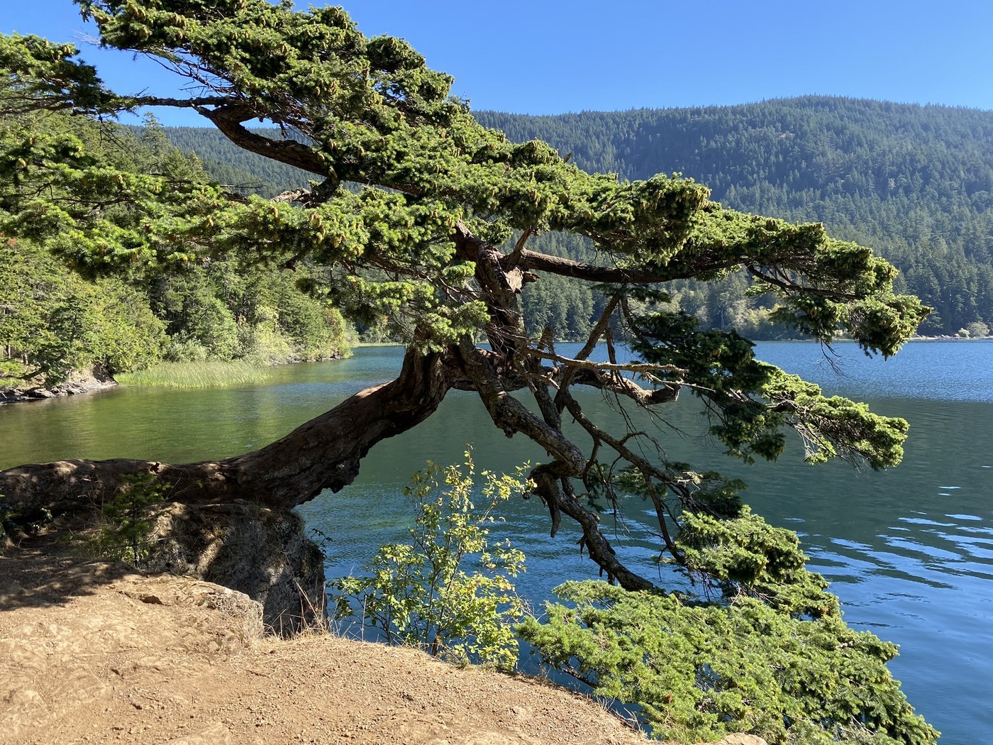 Past this point, the trail becomes more isolated and you retreat into the woods around the lake. Various viewpoints are scattered throughout the trail along the western banks. You may recognize a Douglas fir tree that is a popular subject of photos. There are also few splits in the trail along this stretch. At the first split, stay left around the bank of the lake. The trial to the right takes you to the Rosario Resort. The next split is more of a social trail vs. main trail scenario. Both sides will keep you on the trail, but the one straight ahead will have you climb the rock and gain all your elevation at once, and the other will loop you around and take you up more gradually. Either way, the elevation gain is minimal.