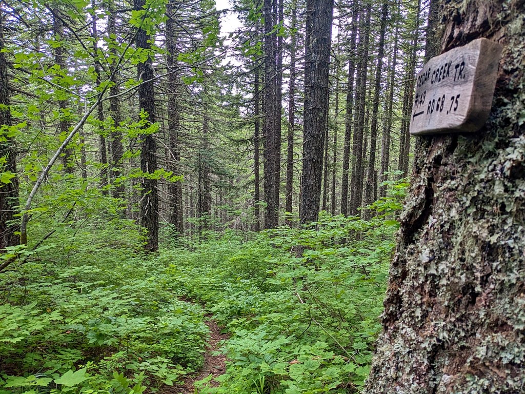 From Forest Road 68 (elevation 3,075 feet), the trail ascends steeply at first through a Douglas-fir forest with Oregon-grape, vanilla leaf and inside-out flower in the understory. The grade soon eases and the climb becomes more gradual and rolling as the trail crosses two dry drainages, one marked by devil’s club.