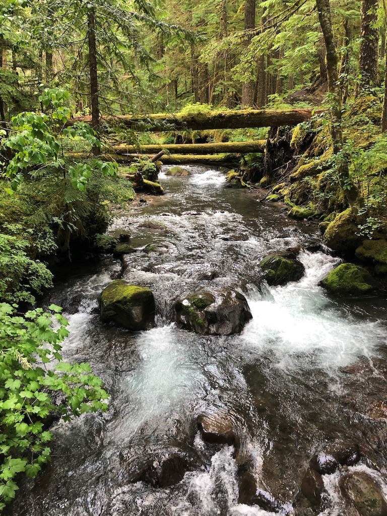 Follow the Toutle Trail from the parking lot and trailhead. It initially descends into a gully, then after crossing a small footbridge, the Cinnamon Trail splits off to the right. Taking this trail, cross a larger stock bridge (with guard rails) over the Kalama River.