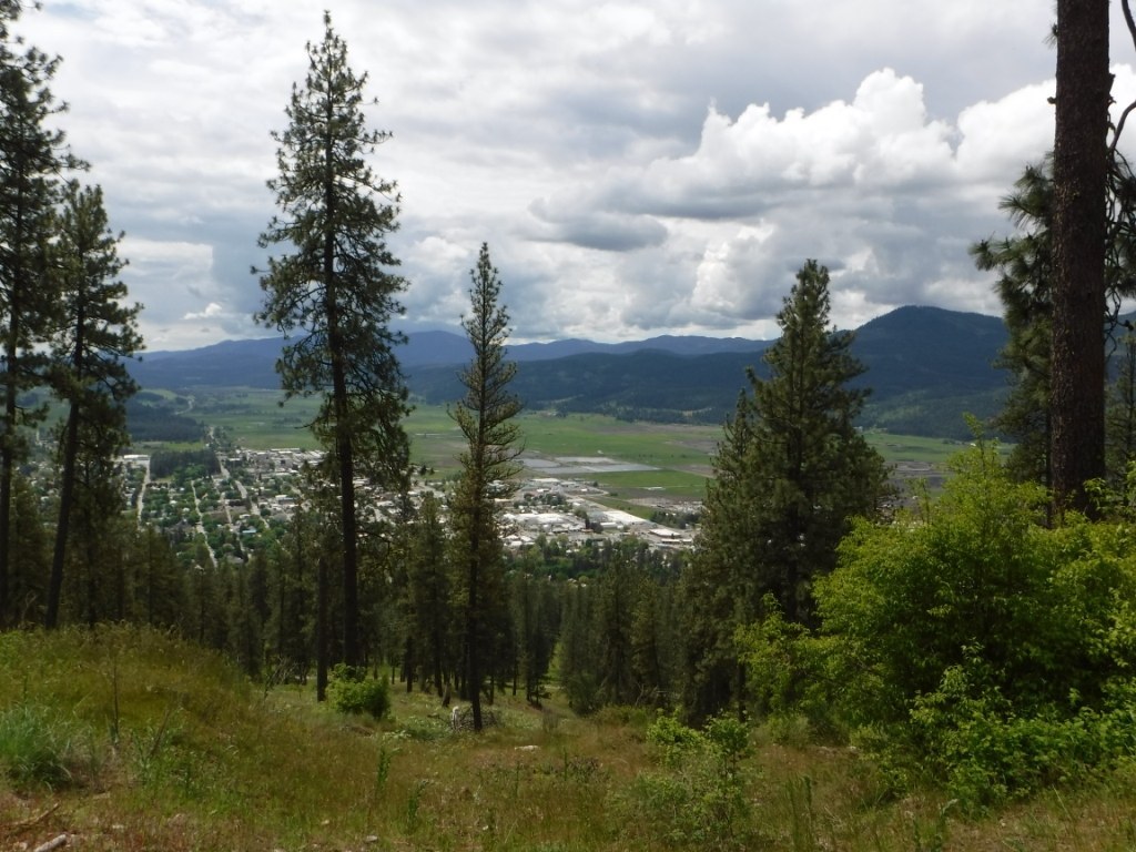 There are several good viewpoints along the loop trail. The trail looks directly down at Highway 395 and Main Street in Colville. As the trail follows the contours of the mountain the views sometimes extend to the mountains both east and west of town. At the uppermost portion of the trail, there is a covered shelter inviting visitors to sit and take in the view.