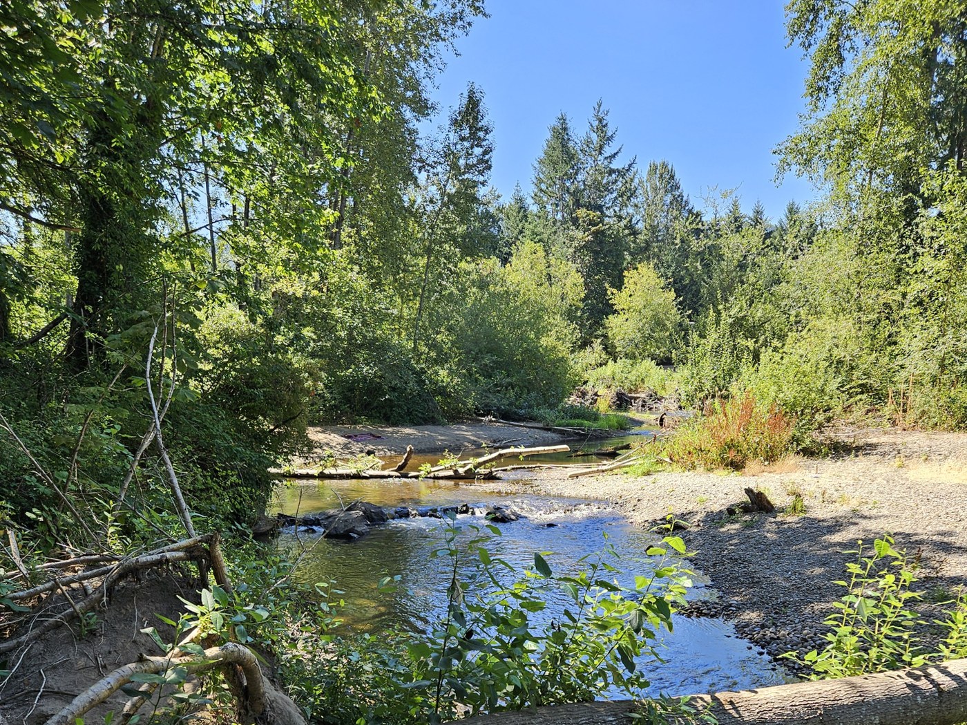 Scenic paths wander through open green meadow shaded by towering Douglas-fir, maple, Oregon ash, hedges of Nootka rose, thimbleberry, dogwood, spirea and oakleaf hydrangea. At the southwest end of the park, dirt-trail access to Issaquah creek features a small beach perfect for a dip in the creek on sunny summer days. Cross a pedestrian bridge over one of the creeks by the meadow. The natural setting provides habitat for observing salmon, deer, bobcat, racoon and various species of birds.