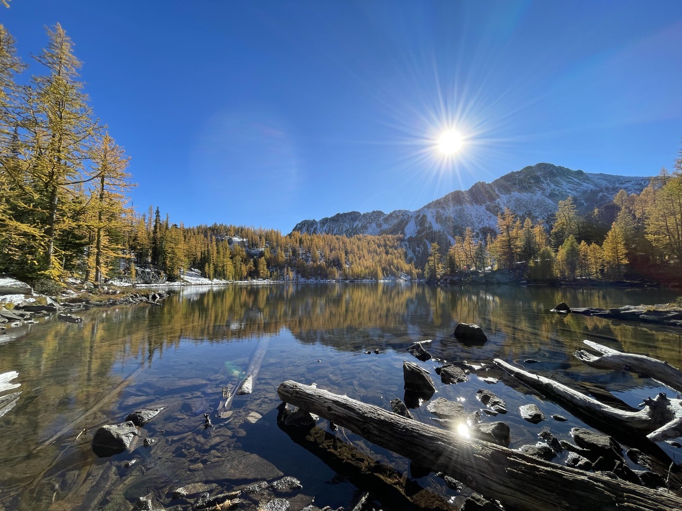 The trails are usually snow-free in early July. At that time, the meadow to the north of the lake is beautifully flowered, but the mosquitoes are also flourishing. In the fall, the bugs are gone and the golden larch provides the bright contrast to the green of the lake.