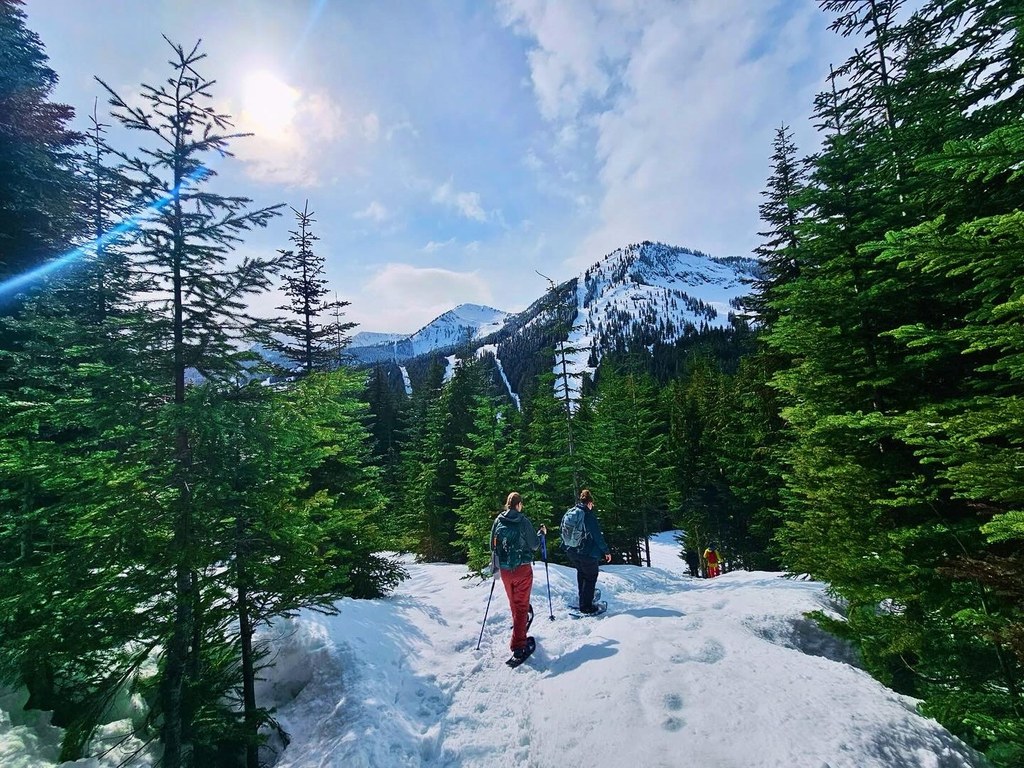 The snowshoe area is easily accessed to the east of the main parking area at the end of Crystal Mountain Boulevard. Snowshoeing gear is available from the Crystal Mountain rental shop including snowshoes and poles. Access the trails from one of two trailheads adjacent to the parking area, then explore the trails as much as you’d like.