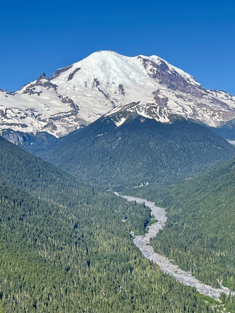 Begin at an unmarked trailhead on the left-hand side of Highway 410. The trail immediately crosses a delightful stream, which you’ll be even more thankful for on the way down; it’s a great spot to stop and dip your feet after four miles of relentless downhill. Cross the water using a footlog with a handrail, and get ready to climb. Quite a bit of elevation is gained in the first mile and a half, using switchbacks that zig zag through a less-than-inspiring second-growth forest. The best part about this section is the shade, and occasional peek-a-boo views of Rainier.
