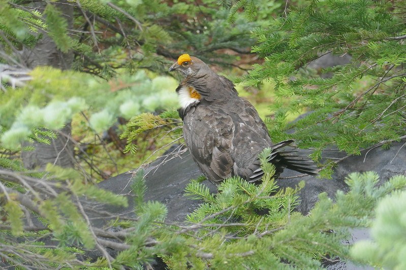Grouse are present in 34 of Washington’s 39 counties. The western slope of the Cascades is home to the sooty blue grouse. Males have blue-gray feathers, complemented by orange and white accents. Females are smaller and less flashy, mildly decorated with brown and gray coloring. To spot one, tread softly and listen for a “whoomp!” calling sound. Look for areas of disturbed soil and stray feathers where the birds are known for “graveling.”