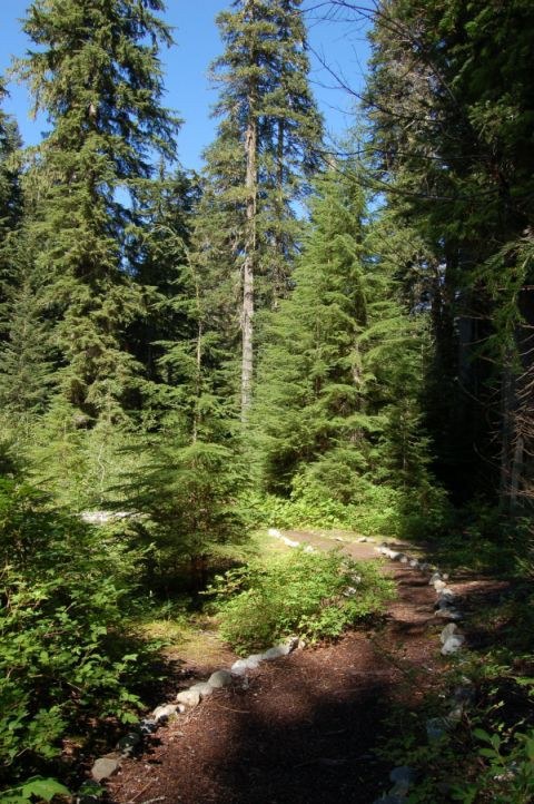 Once you pass the waterfall the trail drops down, breaks out of the woods and into an old avalanche ravine. Here may be some views of the surrounding peaks, if the weather is cooperating. Keep heading down along the flats and reach the river again in five and a half miles. There will be a trail junction and a sign. The right side climbs the ridge to Sawyer Pass and Tonga Ridge. Follow the left fork to some nice campsites along the river. Eat lunch here and call it a day, or proceed along with a backpack to meet the Pacific Crest Trail at Deception Pass or Deception Lakes.