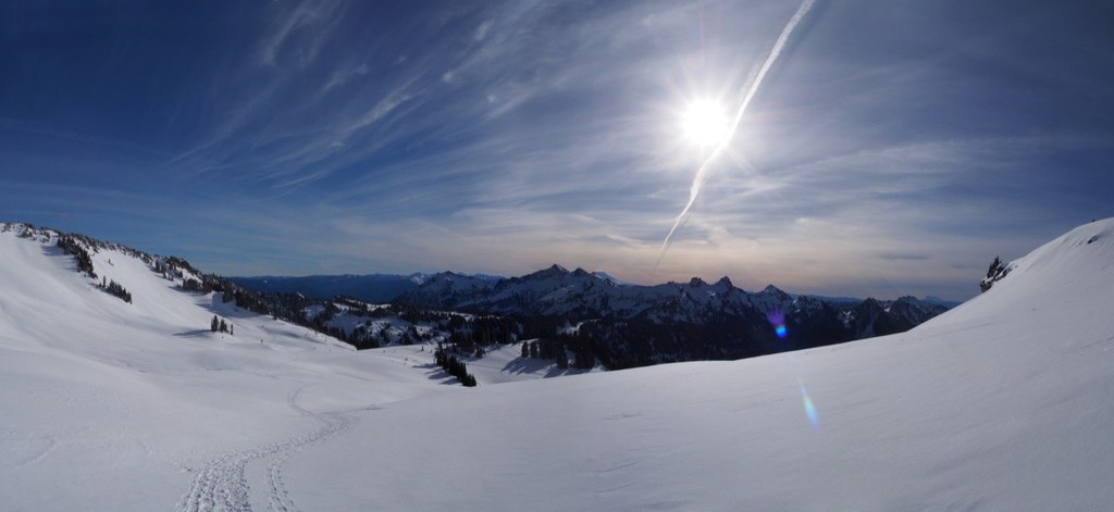 From the Paradise parking area, head north into the snow. There are many winter trails in the area, so a map and some route-finding skills will come in handy. Edith Creek Basin follows the course of Edith Creek, trending NNE from the Paradise parking area. The summer route of the Golden Gate Trail parallels the creek through this area.