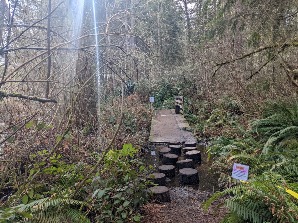 A highlight of the trail is a log hop “bridge” over the marsh. Start at the north trailhead and walk along the wide gravel path for a few hundred feet before arriving at a junction. Turn right and continue in a lush forest for about 0.1 miles to another junction. Turn left here to hop over some short stumps for fun! Turn right at the junction instead, and walk uphill for about 0.1 miles for some elevation gain to a spot with a view of the sound in the distance.