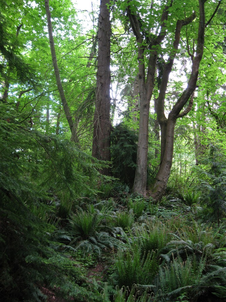 Fauntleroy Park, in West Seattle, is a few blocks southeast of the Vashon Island Ferry dock (it's not the large park north of the ferry dock; that's Lincoln Park). Fauntleroy park offers some impressively tall trees, both conifers and deciduous trees. There is a good system of short trails, with boardwalks, rustic stairs and viewing platforms. Wildflowers are common in spring, and many wild birds make the park their home. The park encompasses the drainage of Fauntleroy Creek that once was a salmon stream, and there currently are efforts to restore the coho run here.