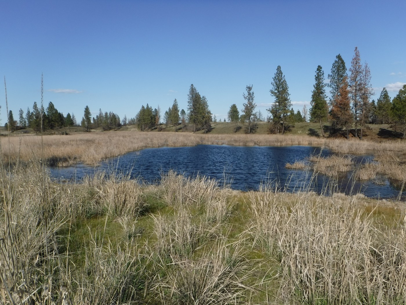 Scroggie Loop is an excellent hike for viewing wildlife and spring wildflowers. With open terrain that passes through occasional stands of Ponderosa pines and past seasonal wetlands, hikers get to experience the variety of the desert country just west of Spokane. Listen for turkeys, watch for deer, and linger near the water to observe birds.