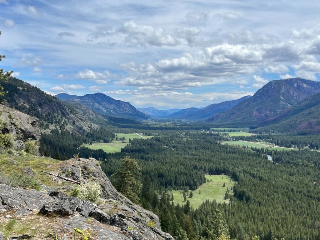 Sagebrush Flats is an open area with lots of sagebrush which provides expansive views of the Methow Valley and the Sawtooth Range. This is a popular rest and turnaround point for hikers. At the flats, one option is to continue on what is now the Spokane Gulch Trail, descending to Mazama and finishing with a 1.6 mile road walk back to the Fun Rock Climbing Area.