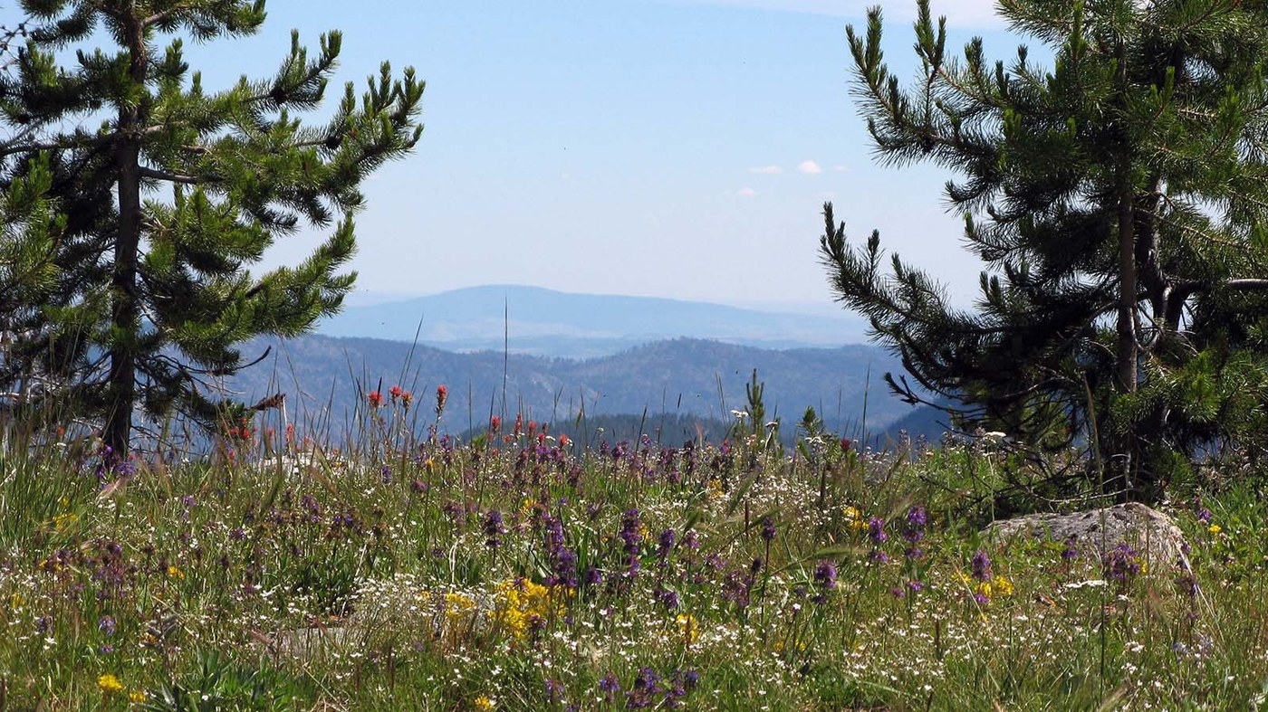 From the pass, hikers may prefer the solitude of the abandoned segment of the North Summit Trail as it winds through open forest and meadows on the ridge crest to the north. In places, small cairns are the only trail indication as the route continues to a shoulder of Old Baldy Mountain, 1.5 miles from the pass and 7250 feet high. In early summer, this route passes through many flower garden meadows, providing colorful foreground to the views to the east, south, and southwest. At the shoulder, some hikers may want to leave the trail and scramble up the additional 0.7 mile and 600 feet to reach the top of Old Baldy Mountain.