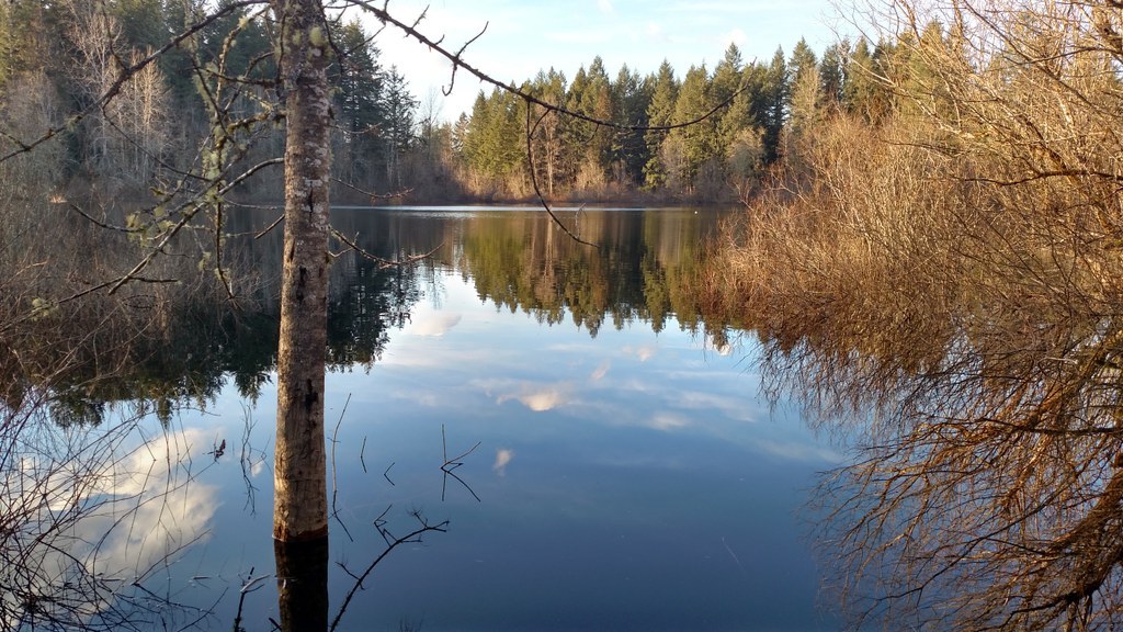 At the large sign, turn left down a short boot path to see a view of Grass Lake or continue straight along the main trail. After about 0.2 miles, approach a three-way junction and a map. Turn left to go to the lakeshore again, this time to see the lake from a different angle, and then return to the junction. Go straight or turn right for the one-mile loop trail. The trail meanders through a vibrant-green mix of salal, Oregon grape, sword fern, and a wealth of deciduous shrubs.