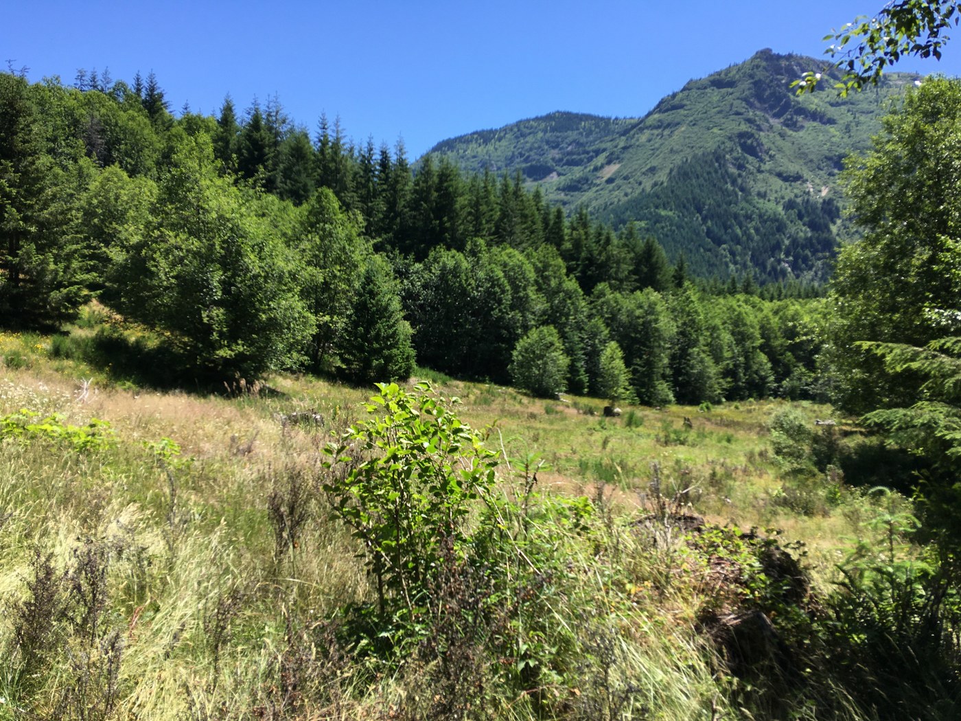 Starting in a volcano blast area that was salvage logged and replanted in Douglas-fir monoculture, the trail follows the Green River west down the glacier-carved valley. In 0.3 mile, the trail passes a waterfall viewpoint becoming obscured by recovering forest, now more heard than seen. At 1.1 miles, the trail traverses a brushy opening with views up to the surrounding slopes of Goat Mountain and the Mount Margaret Backcountry. It passes the first (dry) campsite on the right at 1.2 miles. The trail descends briefly to river level at 2.1 miles where there is access to water.