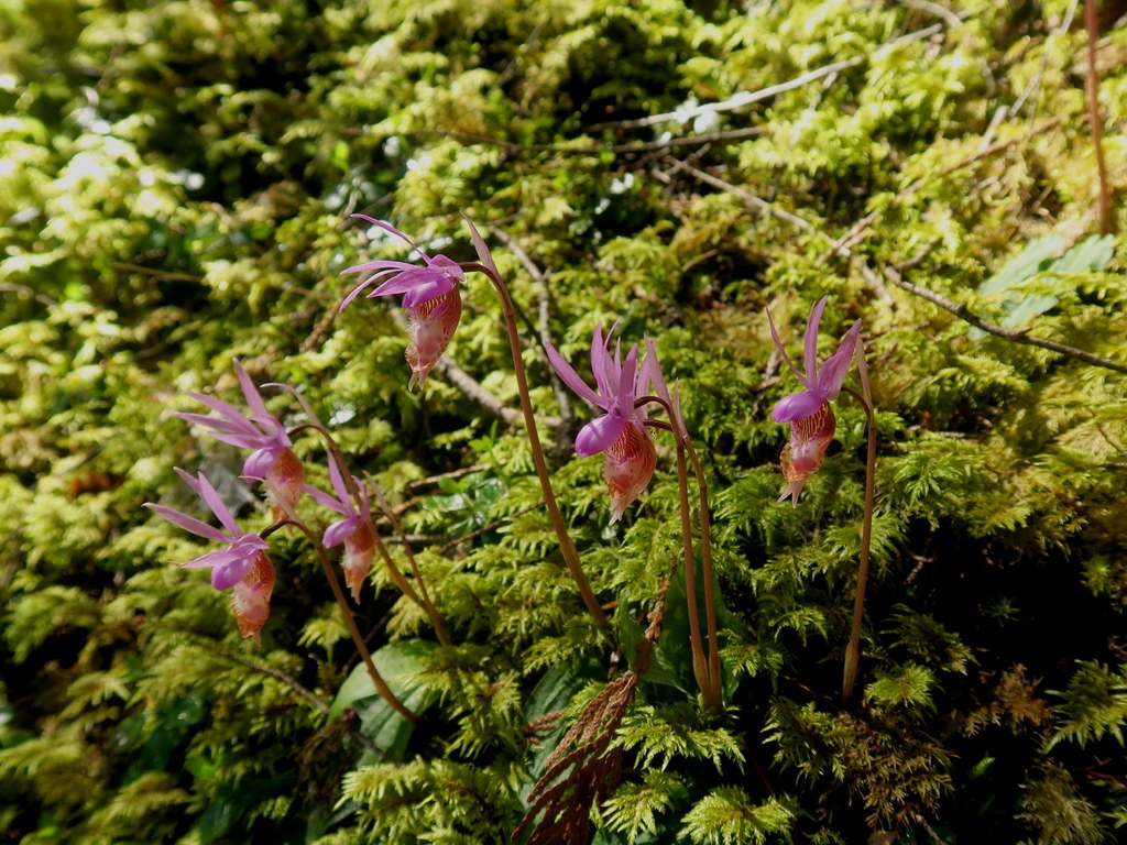 From here, it is a gradual up-and-down through mossy forest and little creeks, the turquoise water showing behind the trees. There are sections of brushy overgrown salal understory and some blowdown, this trail seems to be low on the park maintenance list. In the spring there are clumps of Calypso orchids all along the trail, they are the little pink lady slipper flowers that love the moss and decaying plant matter.