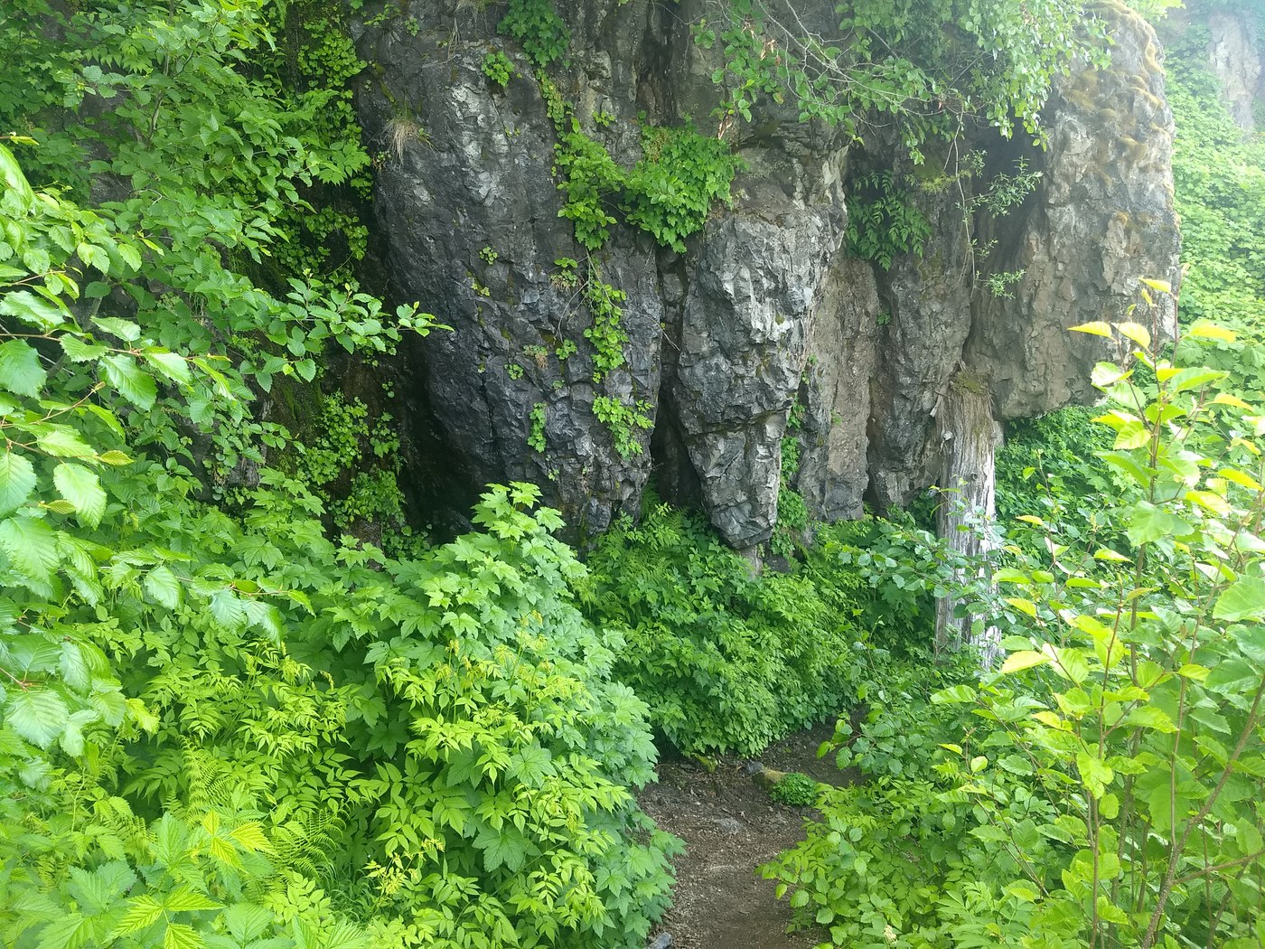 From the parking area, head around the low stone wall and follow the trail left, down the hill. (Ignore the washed out section to the right). Head straight into a green tunnel of alder, maple and ferns, kept for the most part away from the trail. But occasionally they do brush passing hikers on the head and shoulders.
