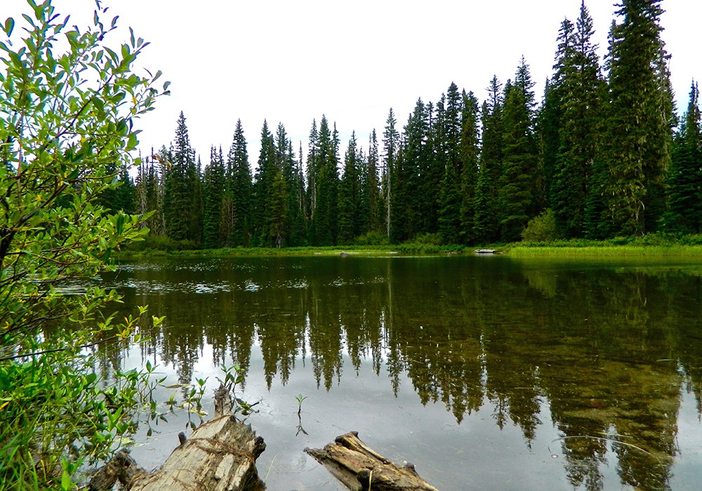 After another half mile of climbing the trail finally tops out near the shore of Horseshoe Lake. The views across the water look onto the entirety of Mount Adams, whose flanks rise high above the relatively flat surrounding plateau. The sound of voices and car doors from the campground only slightly disturb the tranquility of the scene.