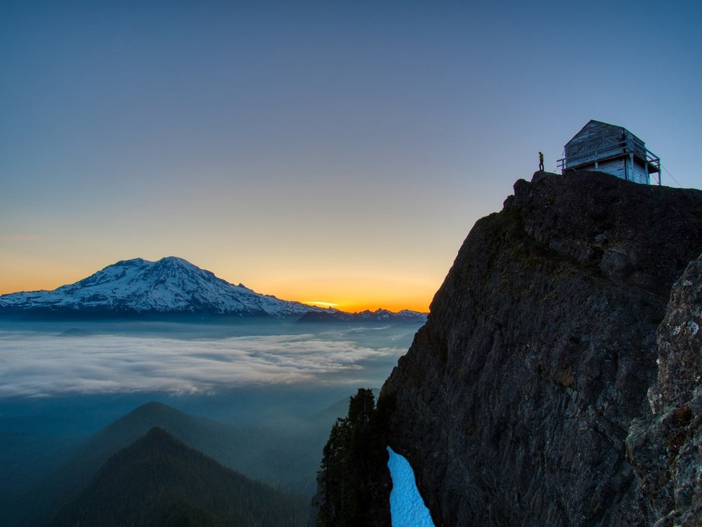 The United States Geological Survey classifies High Rock as a “pillar,” a “vertical, standing, often spire-shaped, natural rock formation.” The exposure on this pillar is worthy of caution; there are no longer any cables to protect you from a sheer vertical drop, as much as 600 feet on the north side. Enjoy the views from the rock or from the wraparound deck of the lookout. Mount Rainier is to the northeast, as is Cora Lake, over 1,800 feet below you. Admire the rocky cliffs to the west, or just gape at the treetops so far below.