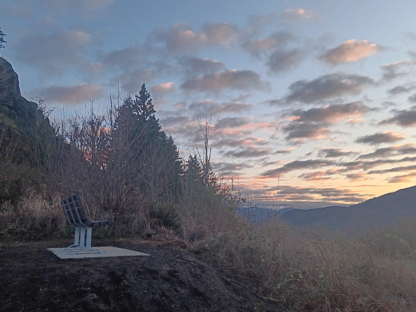 The Big Rock trail can be accessed by parking in the temporary lot off of Mt Vernon Big Lake Road and walking up the gravel service road at the top of the parking lot. The service road goes through the clearcut section of the park, along a ridge leading to Yudwasta. Less than a quarter mile up, there is a bench and a view of Mt Baker and Skagit Valley. At the bench, the trail becomes much steeper and narrower. It continues up Big Rock for a quarter mile of mostly stairs, with short sections of flat trail in between.