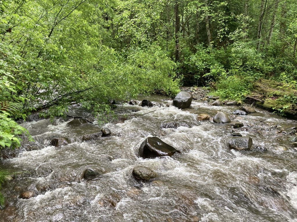 The Holder Creek Trail starts at the parking lot. After the first of many creek crossing, the trail promptly arrives at a junction with the Holder Ridge Trail. For Holder Creek, stay left along a short section that parallels Highway 18. The noise of traffic fades as the creek-side brush thickens and the sound of running water takes over. Continue on as the creek flows closer, then farther from the trail.