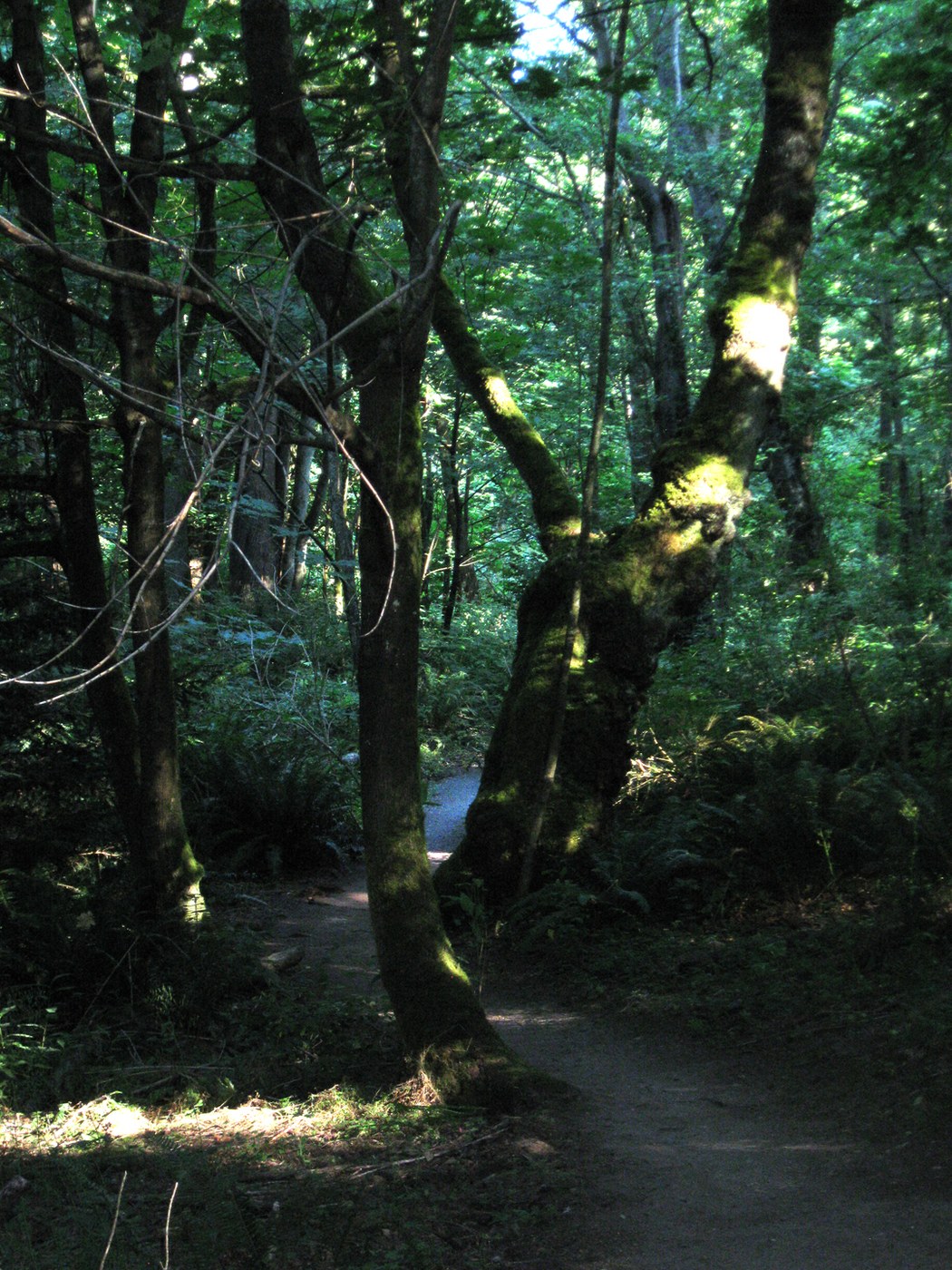 These park trails wind through some fine forest with some large Douglas firs and Western redcedars. There are large alders and maples too, and they are most impressive when they are leafed out. There is a lot of moss, particularly in moister areas near the ravines.