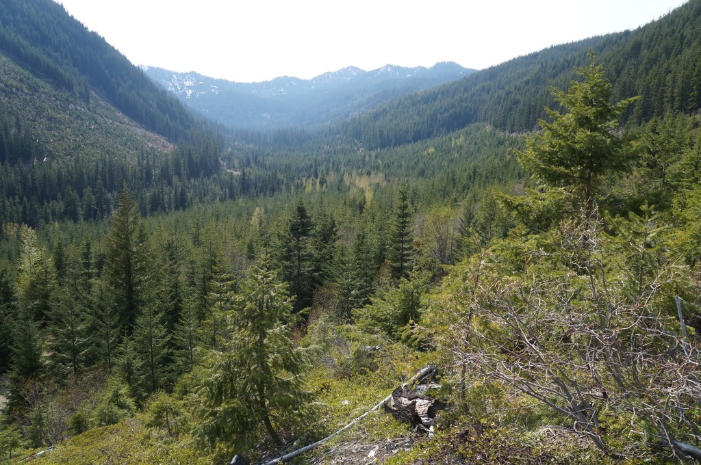The trail takes off steeply climbing at 1,700 feet per mile, a preview of its overall average of 1,000 feet of elevation gain per mile. The initial 0.2 mile is through a clear-cut with a few trees from natural re-seeding. The open area has the advantage of a view up the Thorp Creek valley.