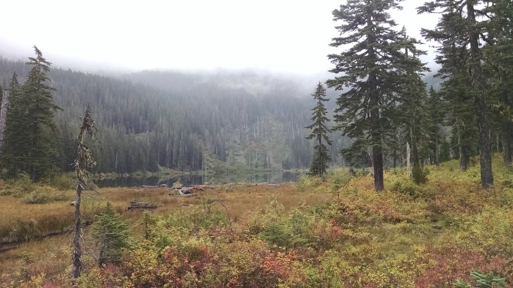 At about 4300 feet, the trail rounds the west end of the ridge and bends back eastward toward Windy Lake. There are three or four campsites at the west end of the lake, which has a high shore with a picturesque view. Huckleberries abound here in the late season.