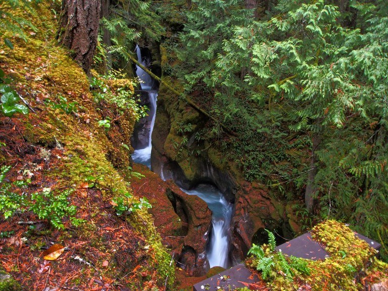 Located behind the Gorge Powerhouse in Newhalem, Ladder Creek Falls offers a refreshing woodland retreat with exotic flora and close-up views of the third tier of this spectacular waterfall. When the hydroelectric project near Ross Lake was under construction during the 1930s and '40s, owner and developer J.D. Ross built a trail to nearby Ladder Creek Falls to showcase the area.