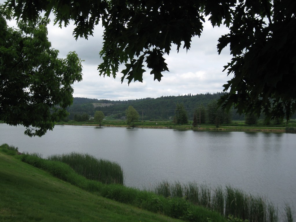 Monroe's Lake Tye definitely qualifies as a lowland lake. The state Department of Fish and Wildlife pegs the lake's elevation at a mere 29 feet, and many visitors do come here to fish (the lake is stocked with trout and bass.) A wide paved trail, officially 1.63 miles long, encircles the lake for use by hikers and joggers (it's also wheelchair-accessible.) The trail is never more that a few feet above lake level so elevation gain is not an issue here.