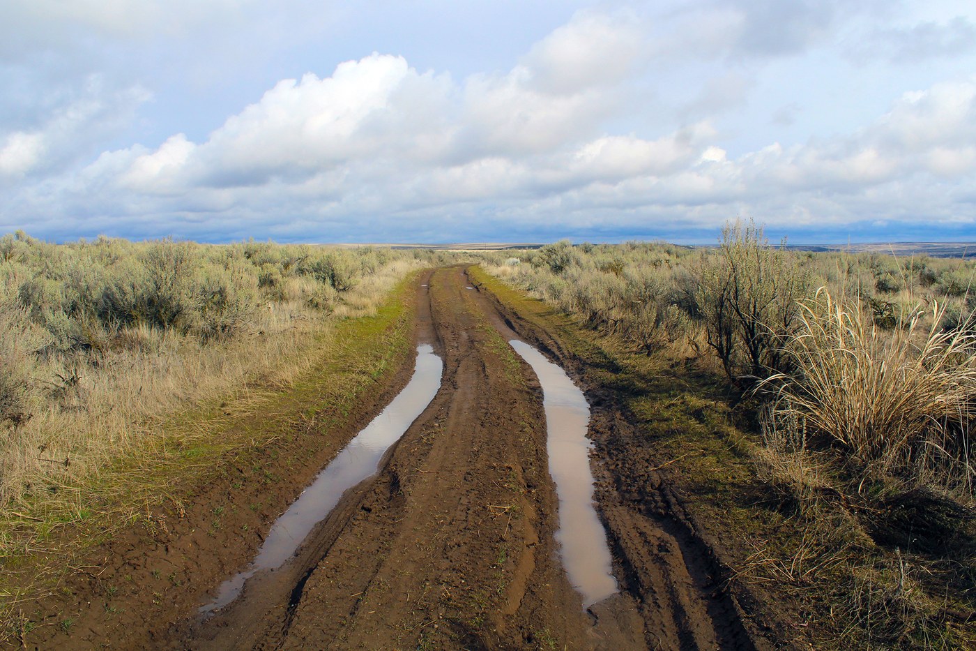 At 2.1 miles the way come to a junction with the Odessa-Lake Creek Trail. Turn right, going north now, and proceed on the wide and easy former road. One of the purposes of the road network was to allow access to maintain the many miles of barb wire fencing. Private lands still border the BLM site, and the fences remain.