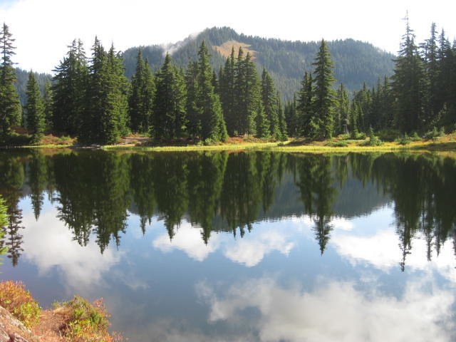 The trail initially spends a brief time in the forest, then it crosses through an old clearcut, then heads back to forest, back to clearcut, and finally forest for the rest of the climb to Hope Lake. The first part of the climb is in a deep valley. It is followed by a moderate ascent through forest, and finally a steeper climb (1.3 miles, 1,000-foot elevation gain) to Hope Lake. In fall, vine maple will brighten this climb.