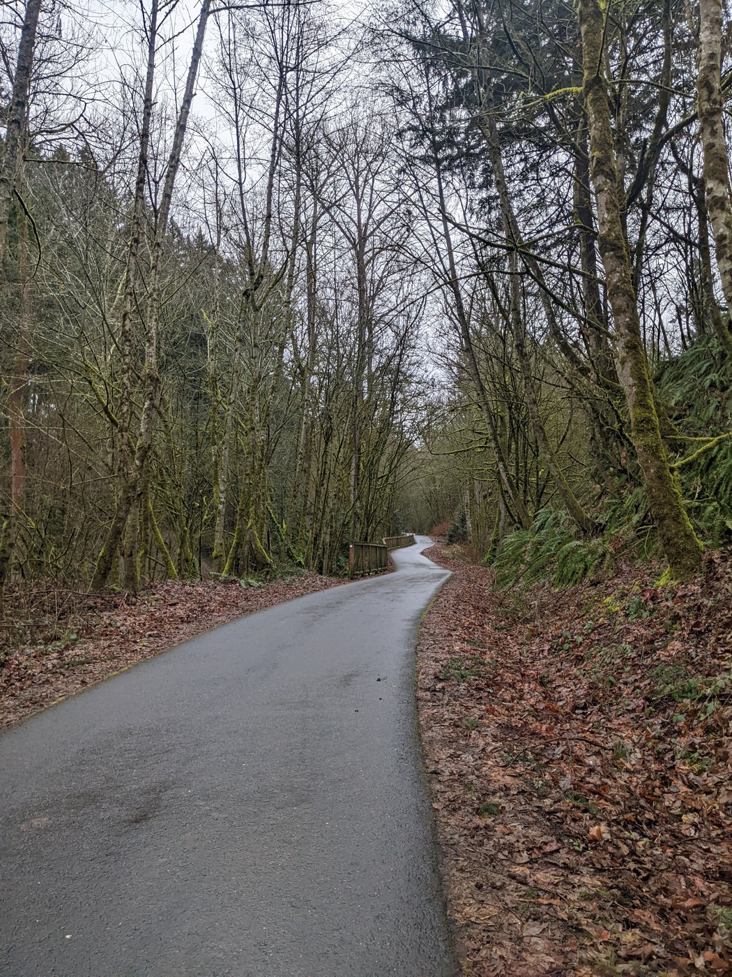 In 0.75 miles, find another bench and trash can to take a break at if you wish. There is a beautiful view here of the other side of the trail steeply dropping to the Hylebos Creek below, trees reaching high into the sky covered in ferns and moss.