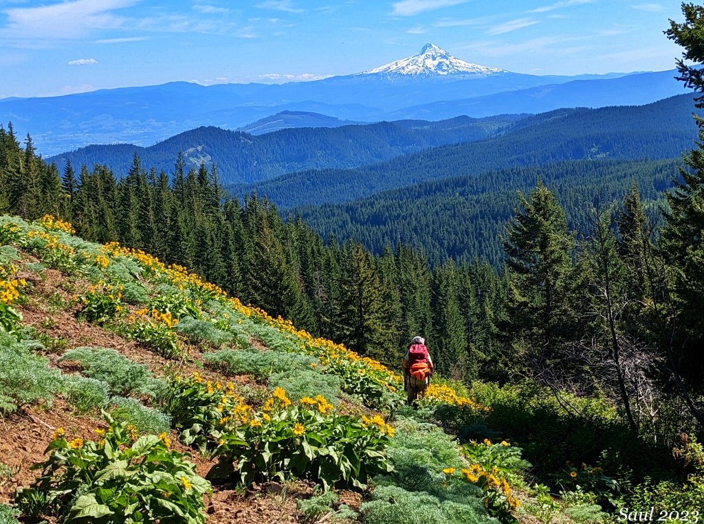 The trail climbs steeply, soon crossing from state land onto U.S. Forest Service ownership and traverses a steep, open slope of wildflowers at 2.4 miles. The trail switchbacks up through the wildflowers and re-enters forest. Still climbing steeply, the trail reaches the ridge top and a junction at 2.8 miles. The trail to the right is the continuation of the Buck Creek Trail down Penny Ridge on an old jeep road.
