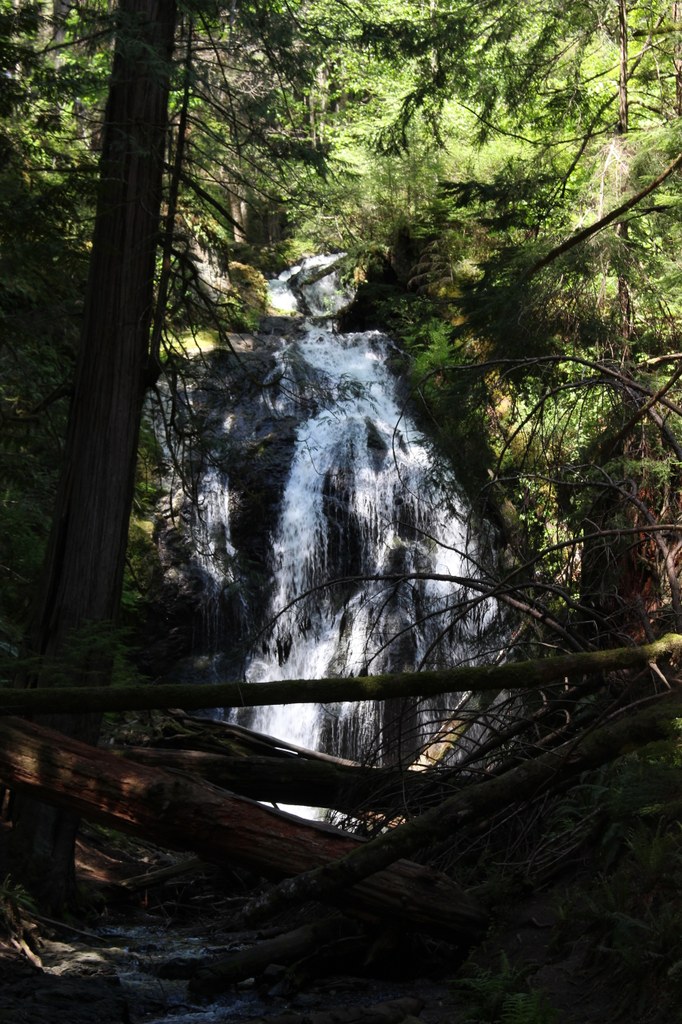 Yet another option is to start from the South Camp day-use parking lot. Follow the Cascade Lake trail to the right across Mount Constitution road. Shortly after the road, there are some interwoven fallen trees above the trail that are interesting to look at as you pass under them. Then, the trail to the falls branches off to the right, and you can follow the aforementioned directions.