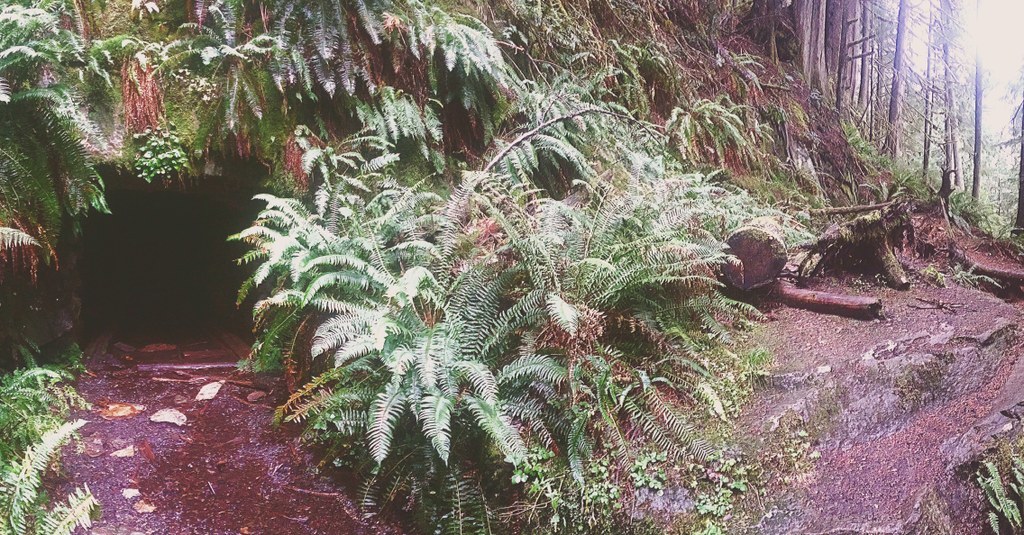 A hole in the hillside framed with ferns, the mine entrance is gated about a hundred feet in, so kids and curious adults can explore a bit in relative safety. There are some beat-up tracks, marking the beginning of the carts' journey into the earth to extract ore.