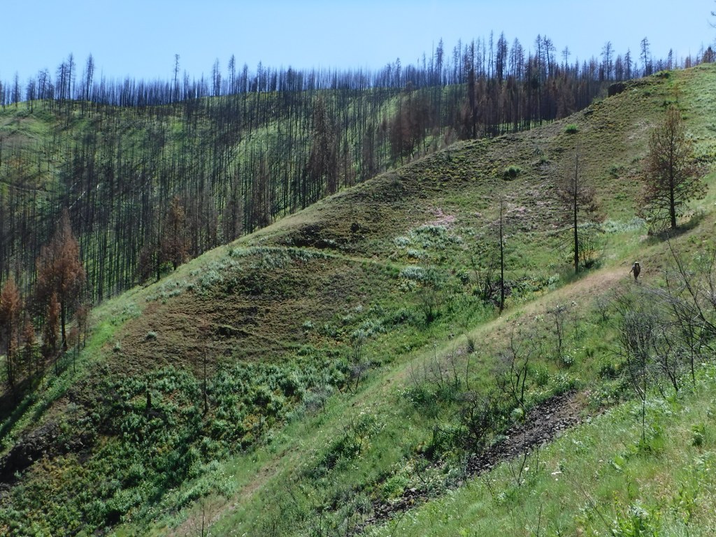 The first 3 miles of trail winds gradually with an occasional steep climb to Moore Flat. It is a tough climb up, but the views are fantastic all along the route. Moore Flat was hit very hard by last summer's wildfire. In some areas the understory vegetation is returning, but other areas burned so hot that the soil is still sterile and nothing is growing at all.