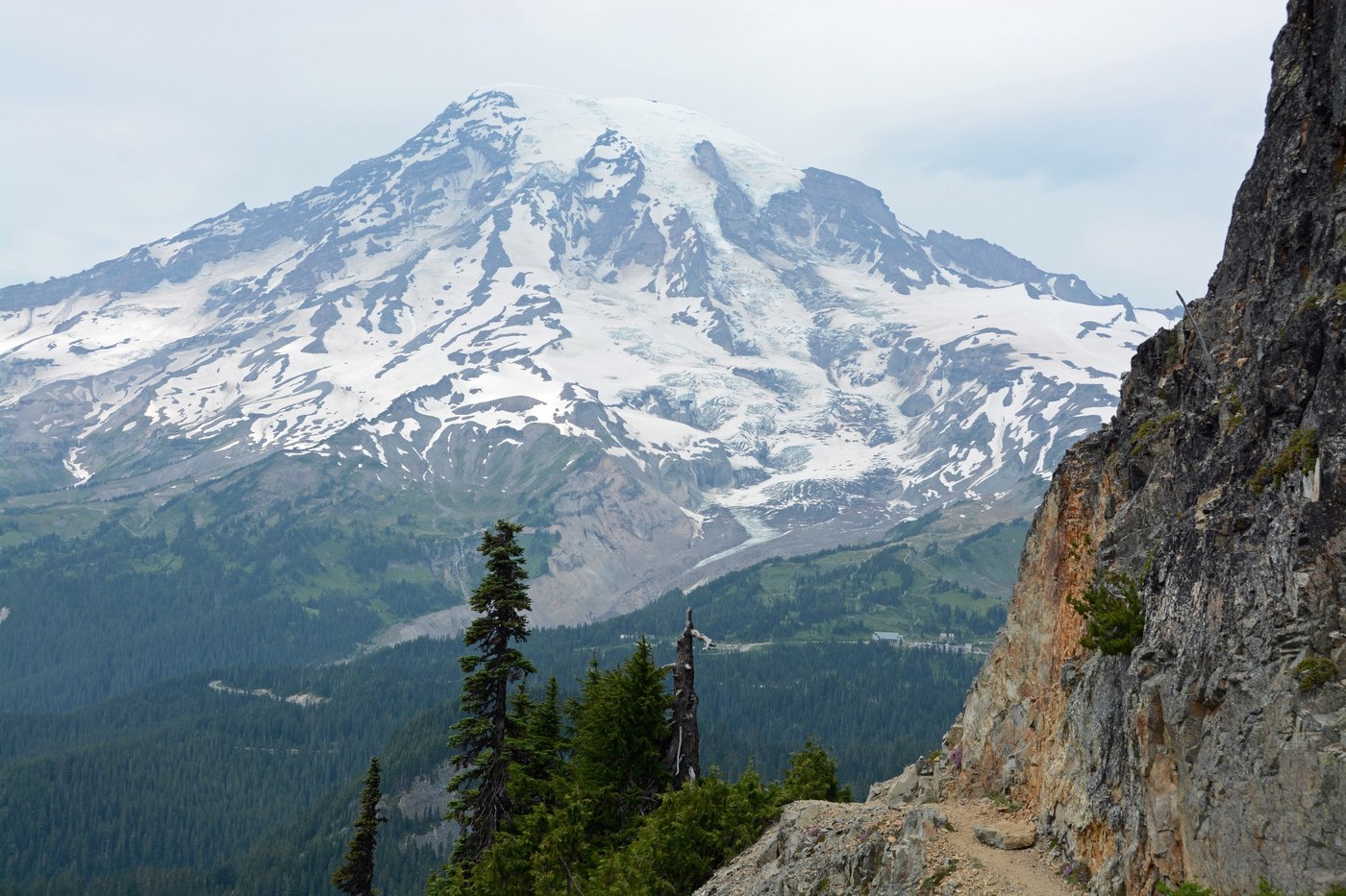 Imagine that you are looking through a telephoto lens at one of those iconic images of Mount Rainier taken from the south. Now zoom out to a wider view of the entire mountain, the thick forests below timberline, the enormous brown gash of the Nisqually River Valley, and beside it the verdant parkland that became known as Paradise. This is the view from the Pinnacle Saddle trail.