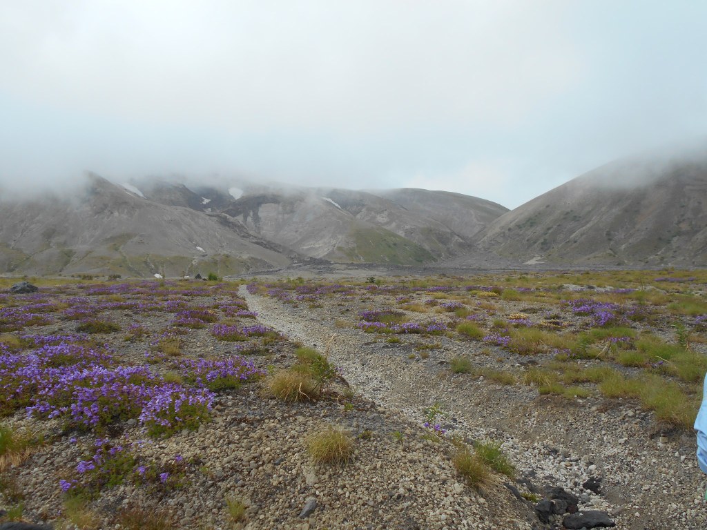 Your route is to the left, away from the blast zone and through a small grove of alder and descending gradually. As the trail wraps around the flanks of the hillside, admire the flower show: lupine, penstemon, paintbrush – the usual suspects are here on gorgeous display. The trail drops to the Smith Creek drainage. Cross it, and head roughly south towards a junction with the Plains of Abraham.