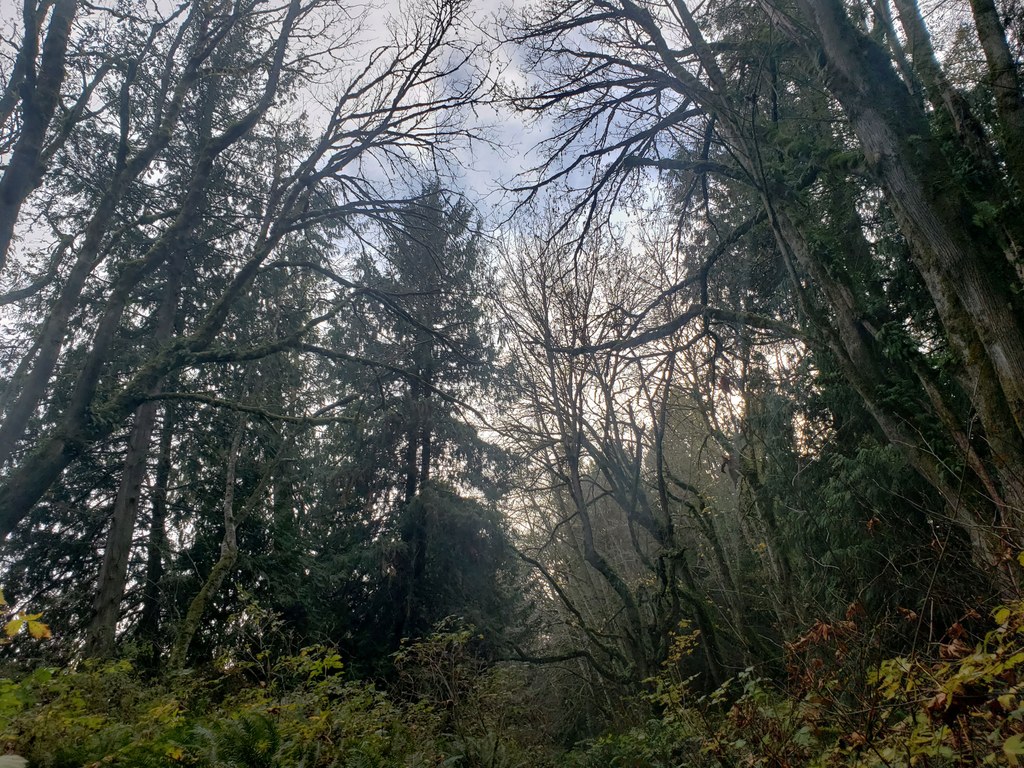 The entirety of a trail is like a double-ended lollipop. You'll start on one trail, wandering through huge trees, ferns and moss (with, admittedly, the sound of traffic for company - the trail is only a few feet from Highway 104). At any forks, stay to the right.