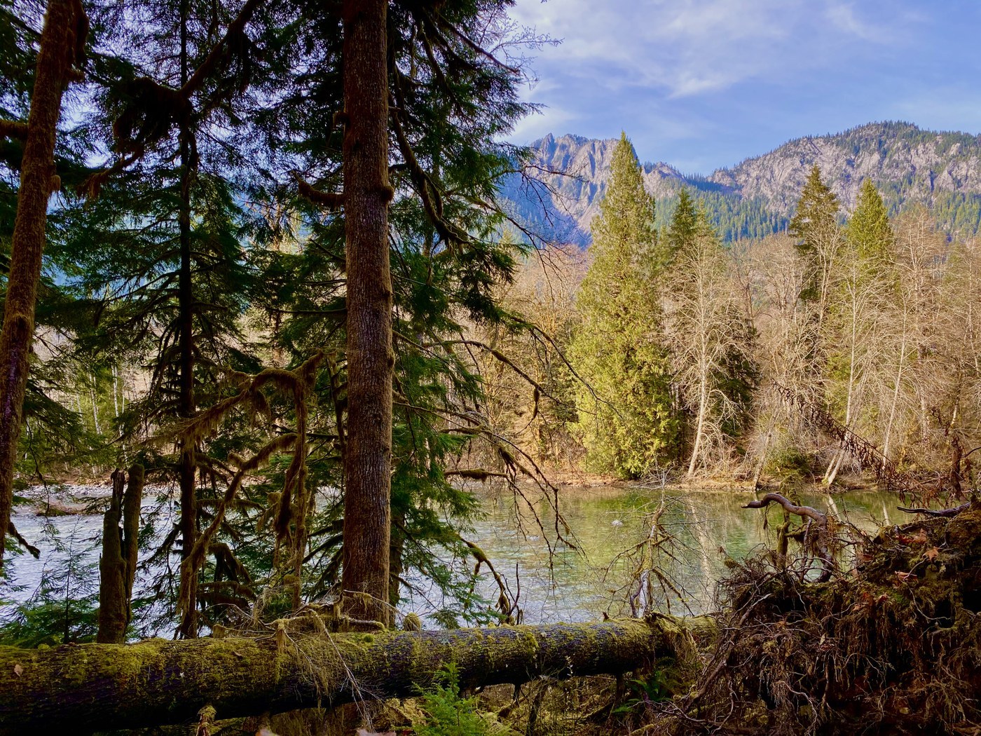 After the ford, head up the Pratt valley for about a mile on old railroad grade before arriving at an intersection signed for “big trees”. This short side trail heads into a forest with old growth, including a massive Doug Fir.